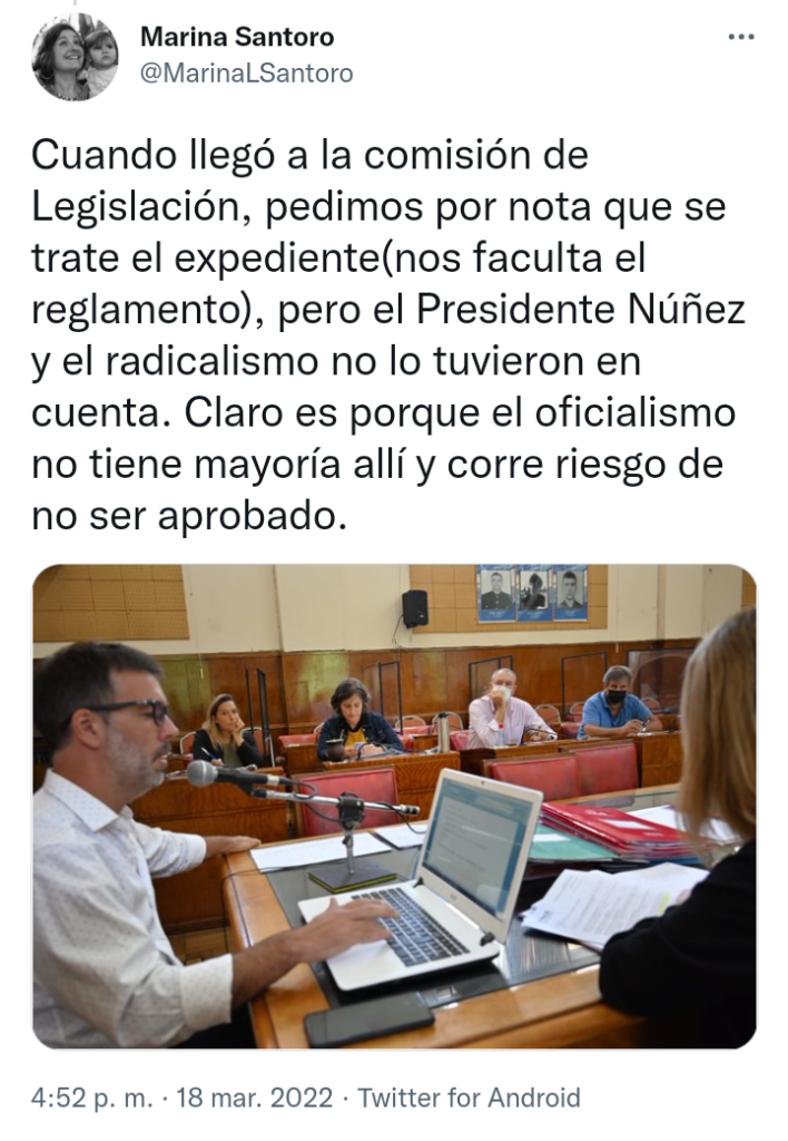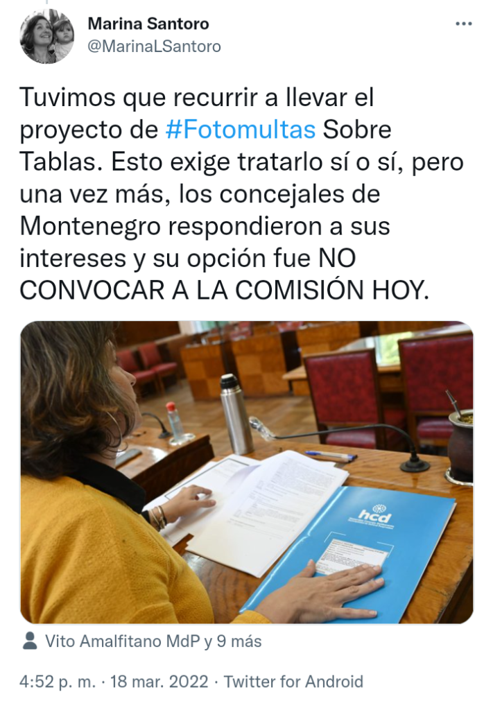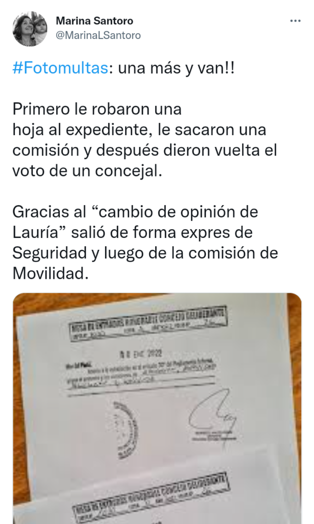 El oficialismo deliberativo ha decidido prolongar el incierto destino del expediente de fotomultas y para ello no escatiman artilugios como postergar el tratamiento de importantes temas, que giran en el ámbito de la Comisión de Legislación, por ejemplo, como lo advierte la concejal Marina Santoro.
