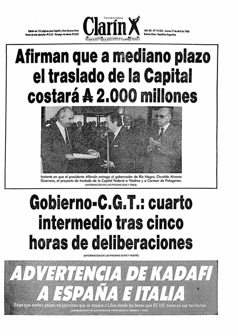 Tras su discurso de media hora en cadena nacional de la noche, Alfonsín partió a Viedma. Allí, el 16 de abril fue recibido por el gobernador radical de la Río Negro Osvaldo Álvarez Guerrero, y luego habló ante una multitud. El entusiasmo de los patagónicos duró un tiempo, hasta la iniciativa empezó a naufragar.