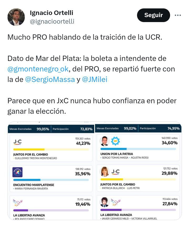 Dato de Mar del Plata: la boleta a intendente de  @gmontenegro_ok , del PRO, se repartió fuerte con la de  @SergioMassa y @JMilei.
