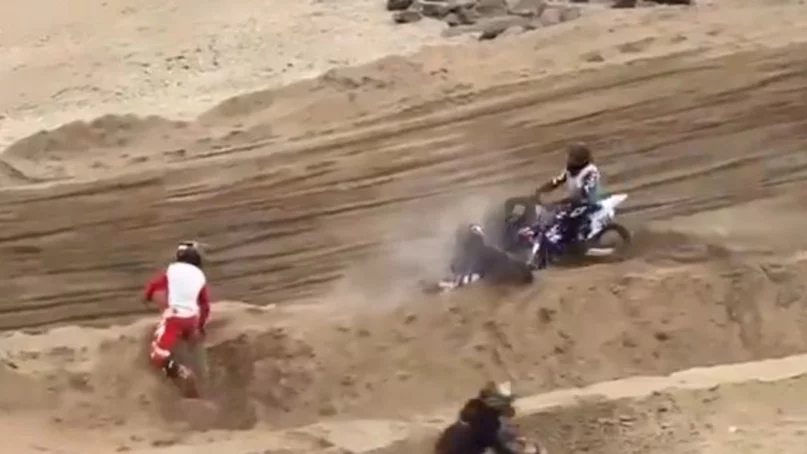 El accidente se desencadenó cuando un motociclista, que había caído tras un salto, fue embestido por otro piloto que llegaba a alta velocidad. Mientras ambos intentaban reincorporarse, fueron nuevamente impactados por otros competidores que también venían a toda marcha sobre la arena, provocando una caótica cadena de colisiones. La escena dejó a uno de los motociclistas heridos en el suelo mientras otro se alejaba del lugar en busca de ayuda. Afortunadamente, el piloto que recibió varios impactos logró levantarse y caminar hasta su moto.