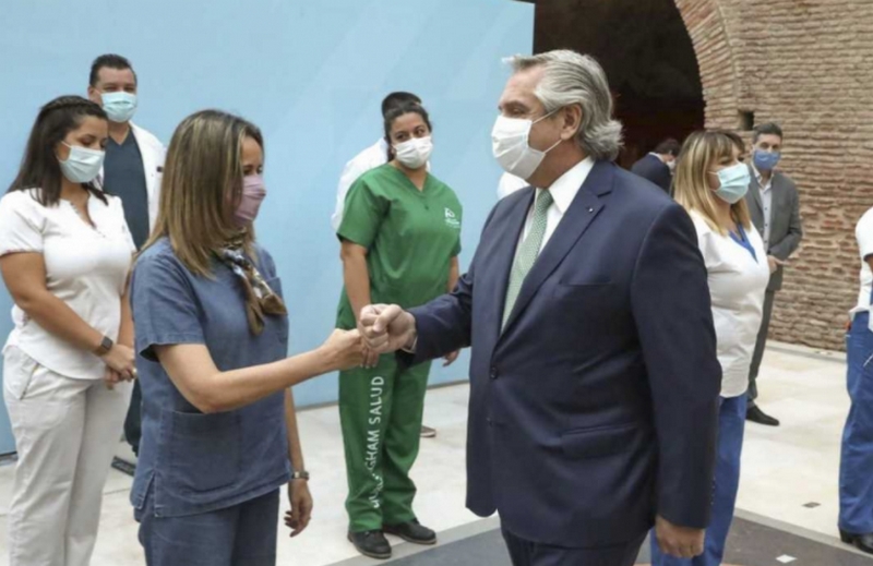 “Hoy estamos anunciando el aumento de camas, la construcción de más hospitales y también anunciamos que durante los próximos tres meses el personal de la salud les vamos a sumar a sus ingresos la suma de $ 6.500 mensuales. Un bono que les ayude a sobrellevar en los meses venideros un mayor esfuerzo. Serán 740.00 personas del sistema de salud las que van a recibir este bono”, indicó el primer mandatario mientras encabezaba un acto en el Museo Casa Rosada.