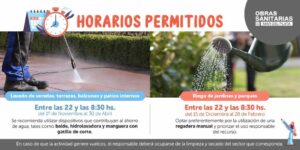 De acuerdo a la Ordenanza Nº 25.795 se establecen horarios para realizar ciertas actividades vinculadas al recurso hídrico: el horario permitido para el lavado de veredas, balcones y patios internos es entre las 22 y las 8:30 . También se recomienda realizar en ese horario el riego de jardines y parques con dispositivos que contribuyan al ahorro de agua en todo momento (baldes, hidrolavadora y manguera con gatillo de corte).