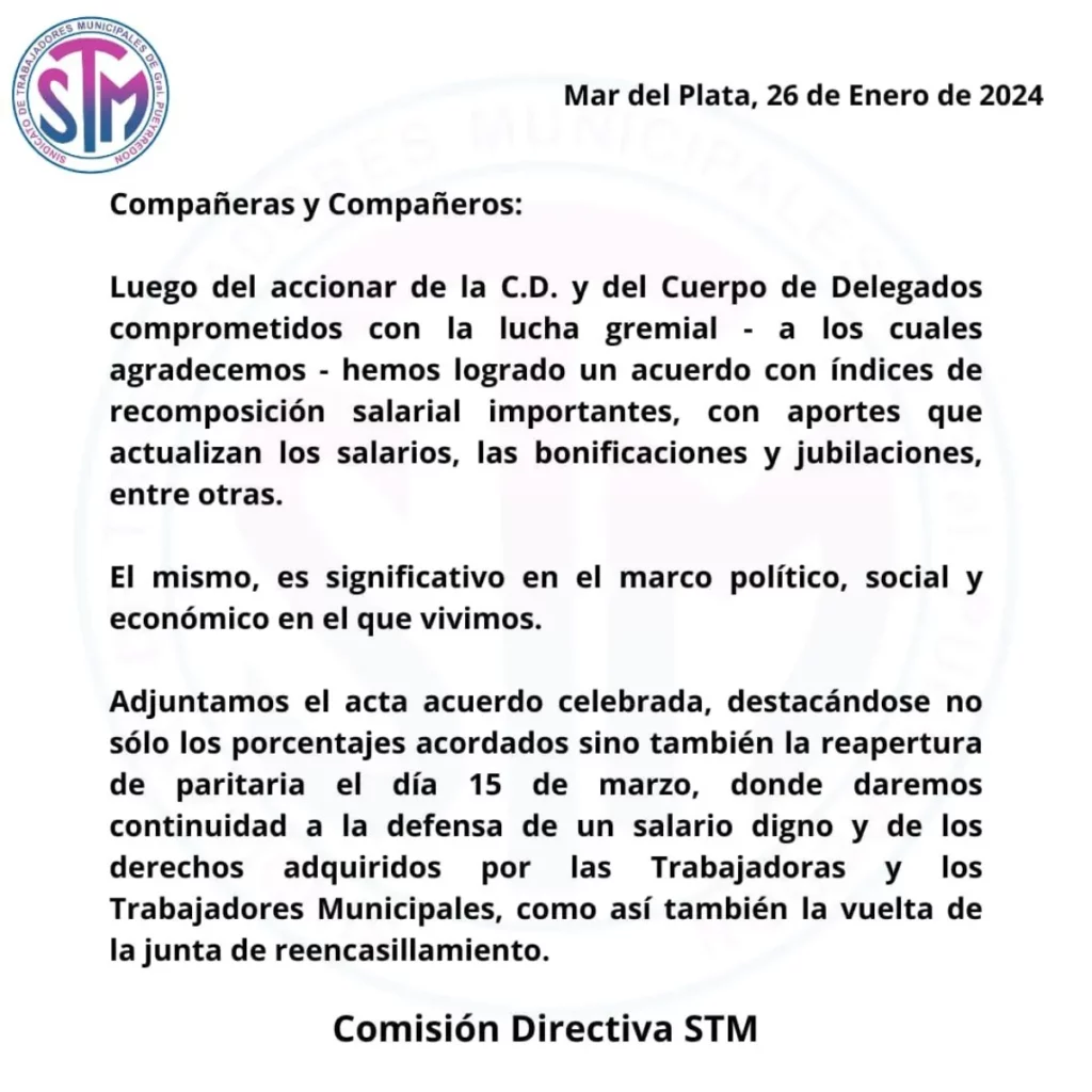 Por medio de un comunicado los municipales exponen los logros obtenidos y resaltan la importancia de este acuerdo en el contexto político, social y económico actual. La Comisión Directiva del STM expresó su agradecimiento a los líderes sindicales y a los delegados por su incansable lucha en pos de mejores condiciones laborales. No descontarán los días de paro.