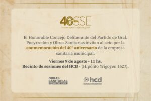 Con motivo del 40º aniversario de la creación de Obras Sanitarias, tendrá lugar este viernes 9 de agosto, a las 11 hs, un acto conmemorativo en el recinto de sesiones del Honorable Concejo Deliberante. En la oportunidad, se reconocerá –con la entrega de diplomas y medallas- a seis agentes que […]