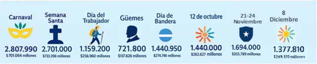 Desde que arrancó el 2025, se celebraron ocho fines de semana largos en donde viajaron 13.342.750 turistas por el país, representando un movimiento económico estimado en $2.971.578 millones (equivalente a US$2.030 millones).