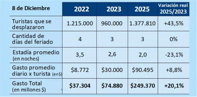 El último fin de semana largo del 2025, otorgado por el Día de la Inmaculada Concepción, trajo consigo un aumento en la cantidad de turistas que recorrieron el país y un gasto total de $249.370 millones, mientras que la estadia promedio bajó.