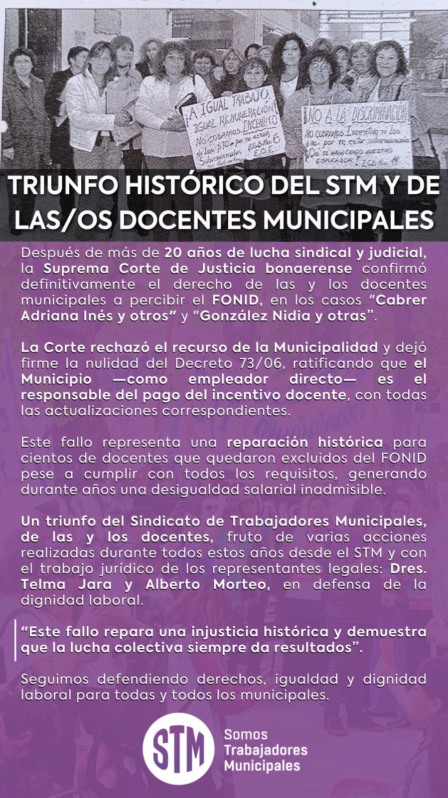 Para el Sindicato de Trabajadores Municipales, este resultado es el fruto de años de trabajo gremial y jurídico llevado adelante desde la Secretaría Docente del STM y sus representantes legales Dres. Alberto Morteo y Telma Jara y sindical, acompañando a docentes que nunca dejaron de reclamar en defensa de su salario y su dignidad laboral.