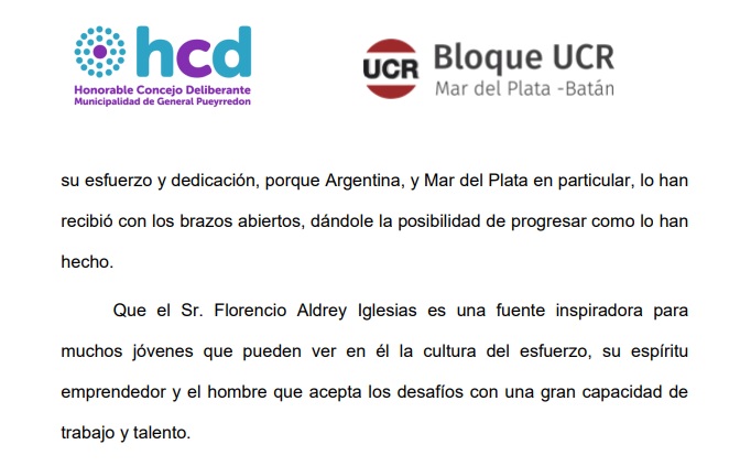 Esta es la terrible contracara de lo que sucede con el expediente por el título de ciudadano ilustre para Aldrey Iglesias, entrado el 12 del corriente por el radicalismo, siendo su autor quien es a su vez presidente del comité local, el Concejal Daniel Nuñez. Pasó por una comisión del concejo y listo, a punto de caramelo.
