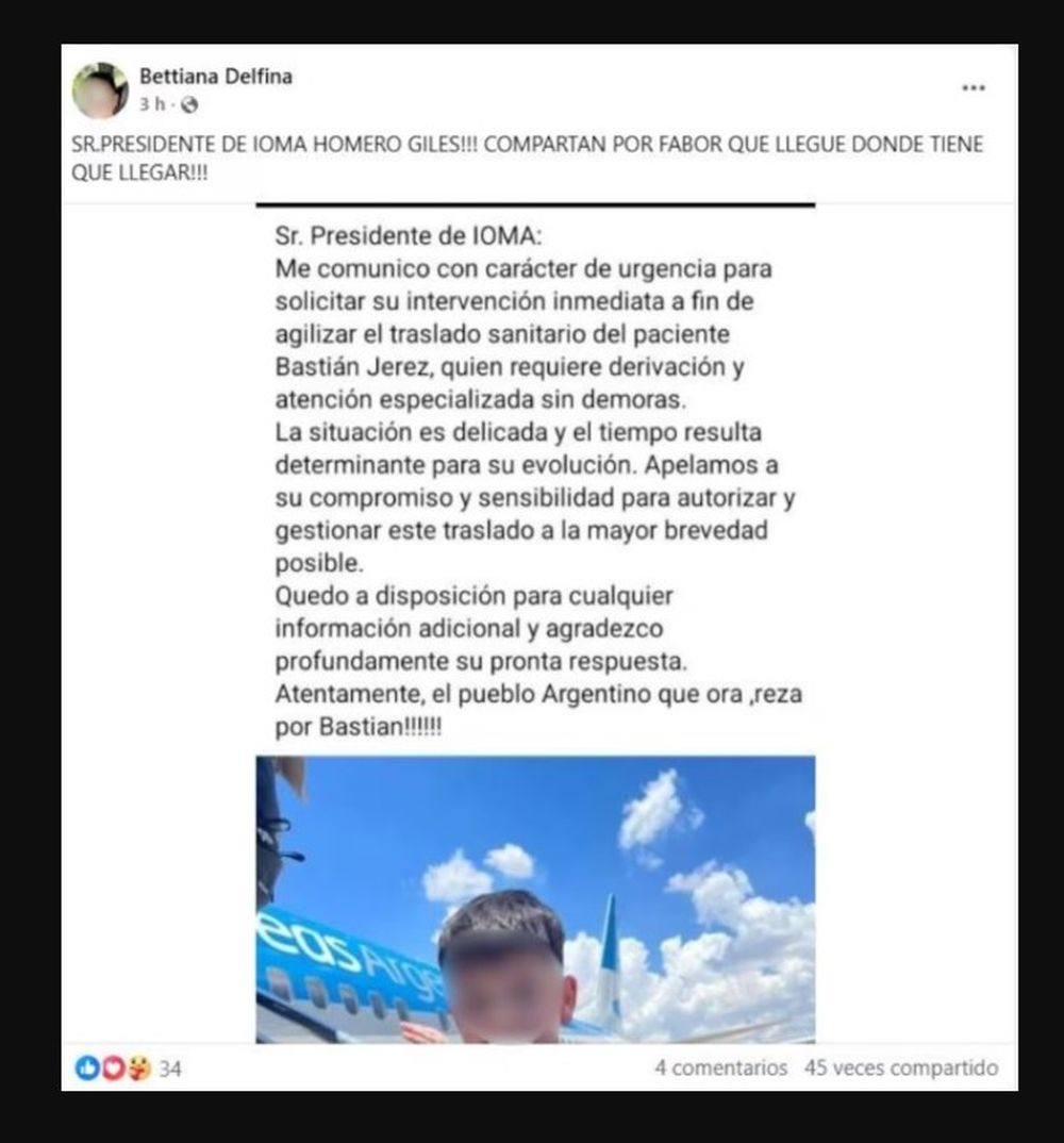 “La situación es delicada y el tiempo resulta determinante para su evolución. Apelamos a su compromiso y sensibilidad para autorizar y gestionar este traslado a la mayor brevedad posible”, sumó.