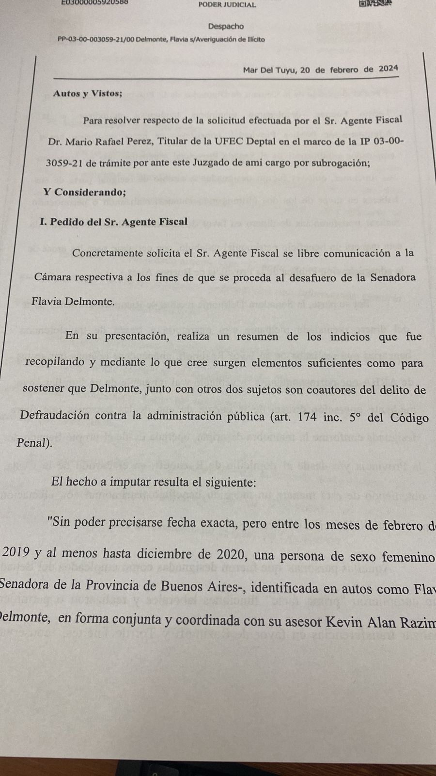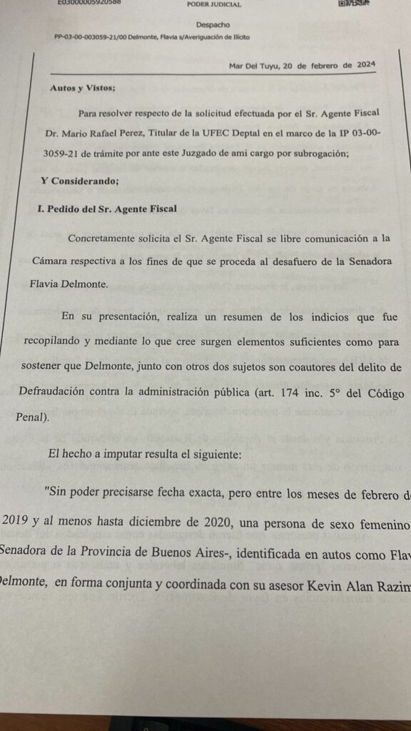 En la misma causa el fiscal pide a la Cámara de Senadores el desafuero de Flavia Delmonte, senadora por la Quinta Sección Electoral por el partido de San Miguel del Monte, “por considerarla autora del delito de defraudación contra la administración pública”.