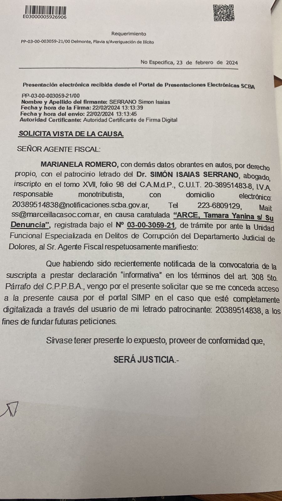 La concejal Marianella Romero solicitó acceder al expediente nº 3059/21, en la que se tramita la causa en la cual fue citada para tomarle declaración informativa que es el paso previo a la indagatoria. El fiscal es el doctor Mario Rafael Pérez de la Fiscalía del Partido de la Costa del Departamento Judicial Dolores.
