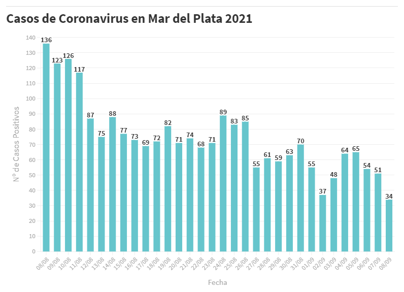 En el último informe del SISA reportado hoy se confirmaron 34 nuevos pacientes en tratamiento por Covid-19 en General Pueyrredon, de los cuales uno corresponde a un caso definido por criterio clínico epidemiológico y 33 a estudios laboratoriales realizados desde el 3 al 7 de septiembre.
