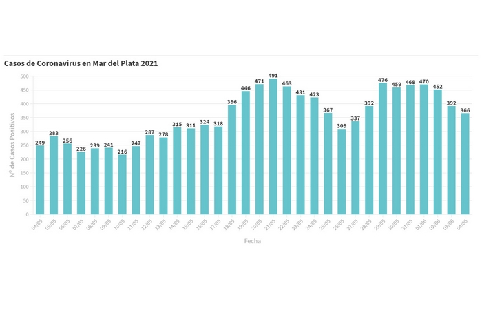 En el último informe del SISA, se confirmaron 366 nuevos pacientes en tratamiento por Covid-19 en Mar del Plata, de los cuales 35 corresponden a casos definidos por criterio clínico epidemiológico y 331 a estudios laboratoriales realizados desde el 25 de mayo al 4 de junio.