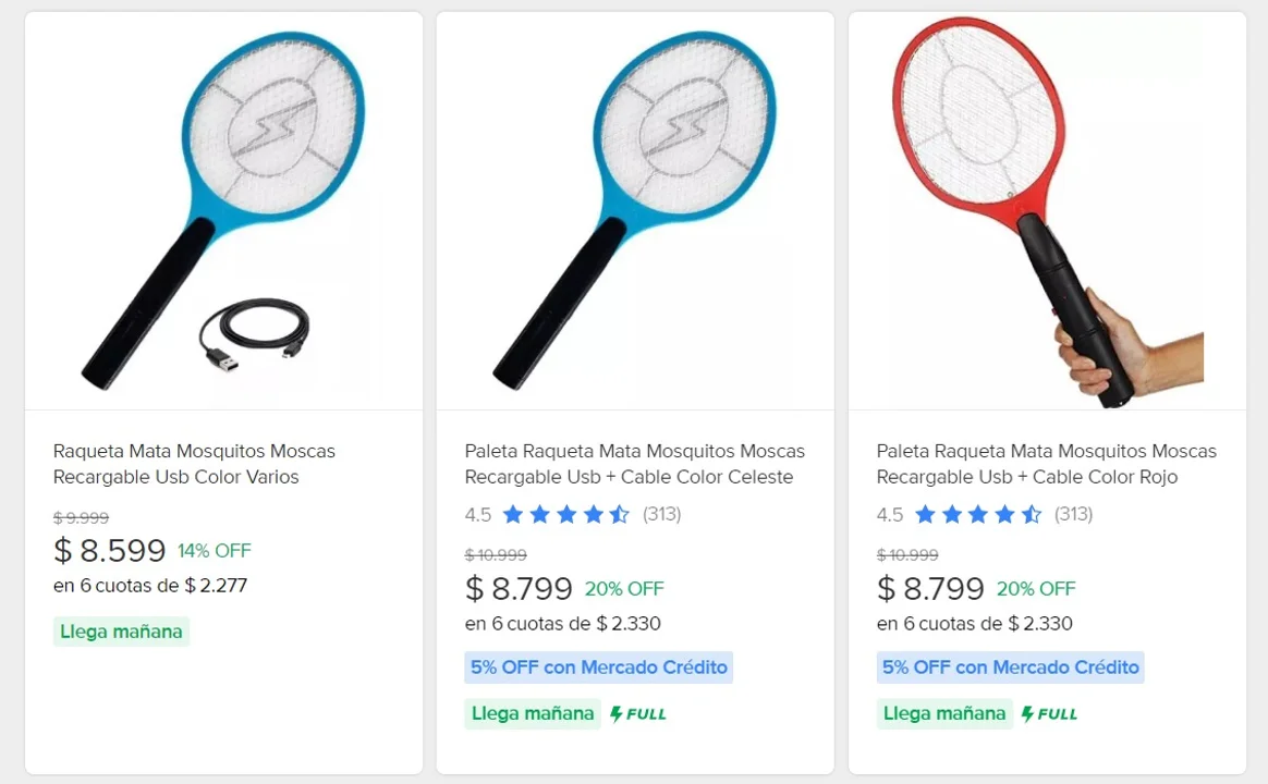 La «Paleta Raqueta Mata Mosquitos Moscas Recargable USB» es una opción popular entre aquellos que buscan una solución eficaz contra los mosquitos. Esta raqueta, altamente calificada con 4.5 de 5 estrellas basado en 313 opiniones, tiene un precio de $8.799, con un descuento del 20% que la sitúa originalmente en $10.999.