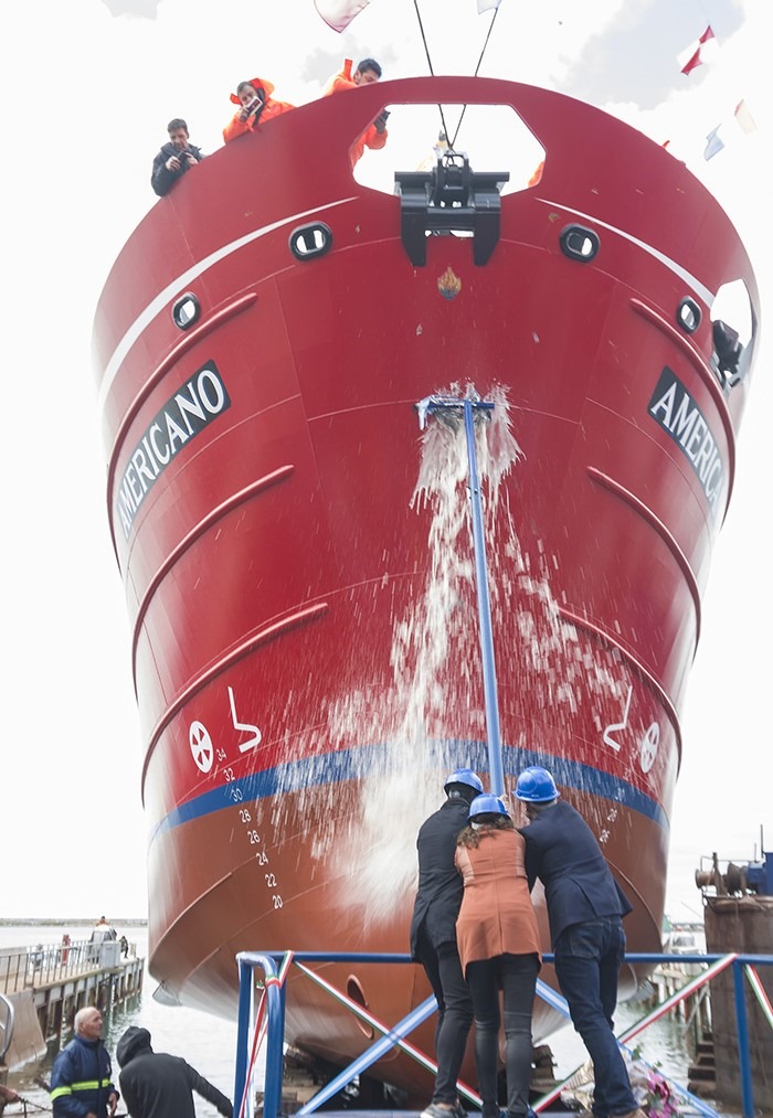 El “AMERICANO” es un hijo de esta crisis, pero también es el fruto de la comprensión y el acuerdo, en definitiva las crisis también son oportunidades. Este barco iba a ser el quinto “Huafeng”, pero las penurias económicas que sufrieron las empresas pesqueras por el atraso cambiario y la caída de precios internacionales, generaron dificultades para cumplir las cuotas pactadas más los mayores costos incurridos por el Astillero. Las mismas dificultades las estaba atravesando el grupo Veraz, y por ello se vio obligado a desprenderse de dos de sus buques congeladores más grandes para poder cancelar deudas, pero en lugar de repartir el remanente y reducir sus aspiraciones decidió reinvertir en la renovación de su buque “Victoria II” que está próximo a cumplir 38 años y que tenía un proyecto aprobado para ser reemplazado por un barco un poco más grande que este. Así se llegó a un acuerdo entre el grupo Arbumasa y el grupo Veraz donde ambas partes hicieron renunciamientos. Por ello queremos agradecer a todos los responsables del grupo Arbumasa por la buena fe y el compromiso que han demostrado, la próxima botadura será de un barco para ellos y confiamos que muy pronto podremos iniciar la construcción del sexto buque que hoy estamos postergando.