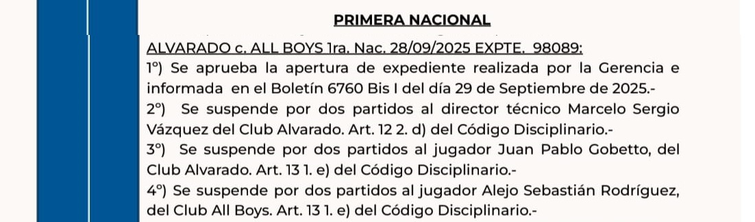 El Tribunal de Disciplina de la AFA, tras el descargo del entrenador de Alvarado, por sus expresiomes en rueda de prensa pots partido con All Boys «el fútbol está muy sucio…» decidió castigar con dos partidos de suspensión al DT ( será una «premonición» ? Le queda una fecha al torneo, y habría un cotejo más para Alvarado, en caso de triunfo del » Torito » vs Arsenal en Sarandí y un empate entre Almagro – Guemes, deberán definir al descendido en un encuentro a finish Alvarado – Almagro en terreno neutral)