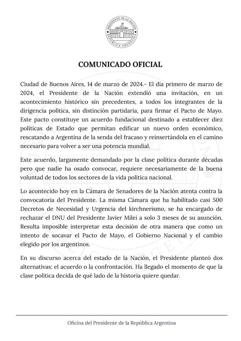 Javier Milei se pronunció luego de que la Cámara de Senadores rechazara su decreto de necesidad y urgencia. Lo hizo a través de un comunicado de la Oficina del Presidente, donde sostuvo que el rechazo de este jueves «fue un intento de socavar el Pacto de Mayo, el Gobierno Nacional y el cambio”.