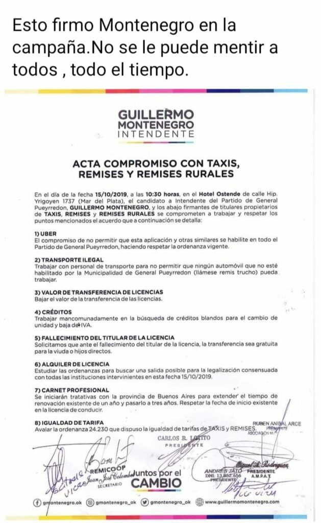 Los taxistas y remiseros que resisten la llegada de plataformas digitales para cubrir el servicio de trasnporte de pasajeros, han insistido en afirmar que el intendente Guillermo Montenegro ha incurrido en serios incumplimientos, que fueron asumidos en tren de campaña electoral de 2018.