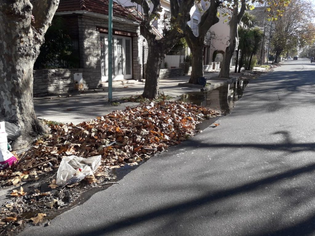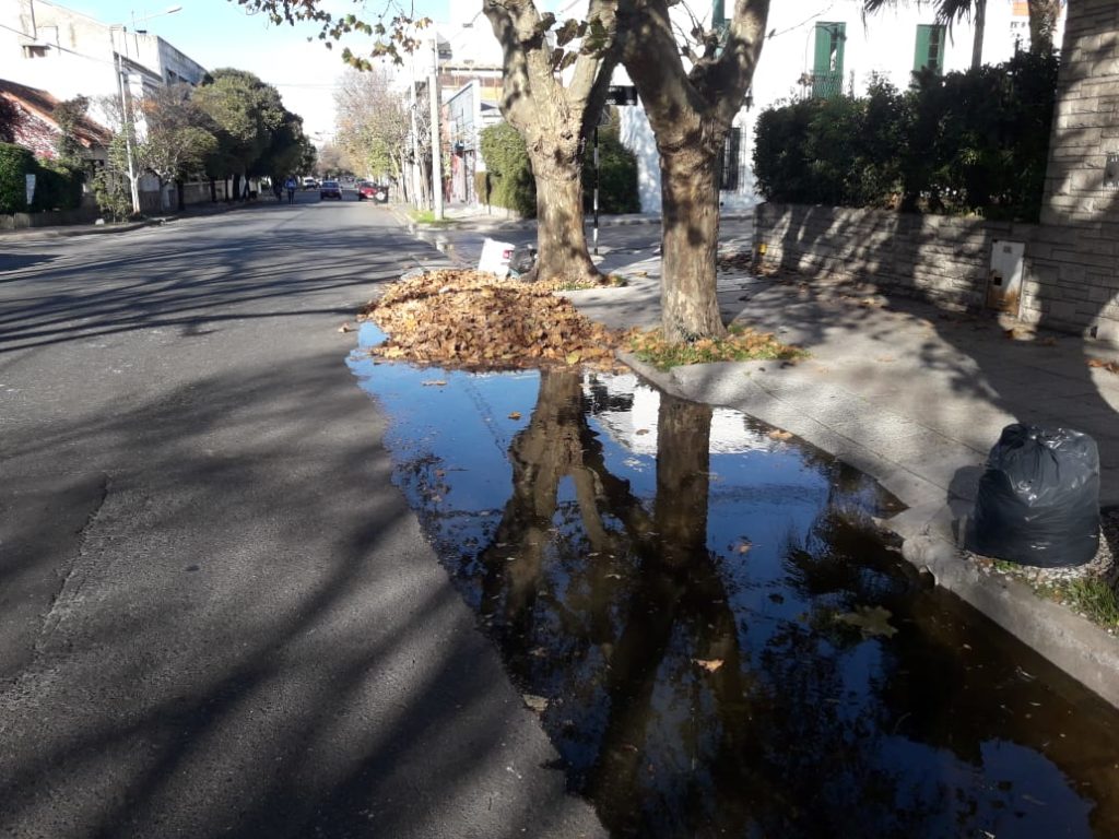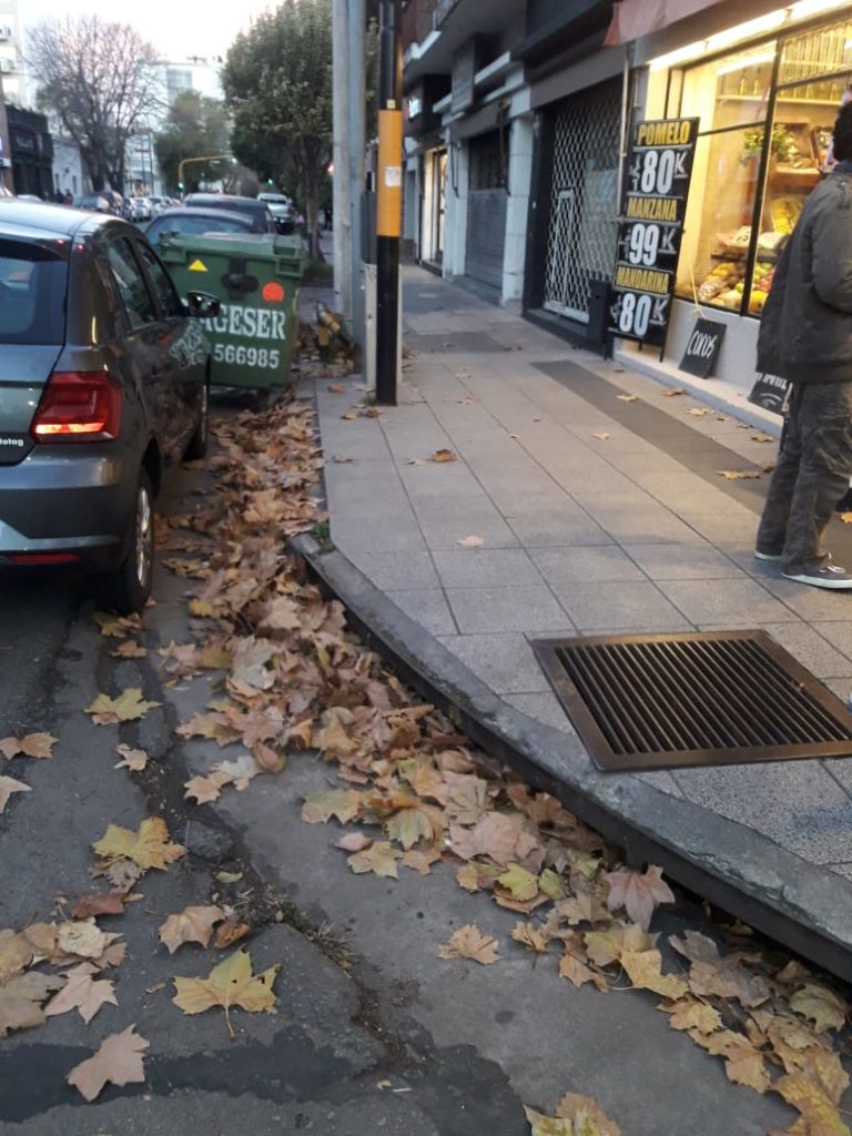 La acumulación de hojas en los desagües o bocas de tormenta son un peligro. Se levanta parcialmente una cantidad de residuos y a las pocas horas la obstrucción continua como puede observarse. Acelera el desgaste del pavimento y cordón cuneta, significando además un peligro para automovilistas, motociclistas y ciclistas, en especial los días de lluvia.