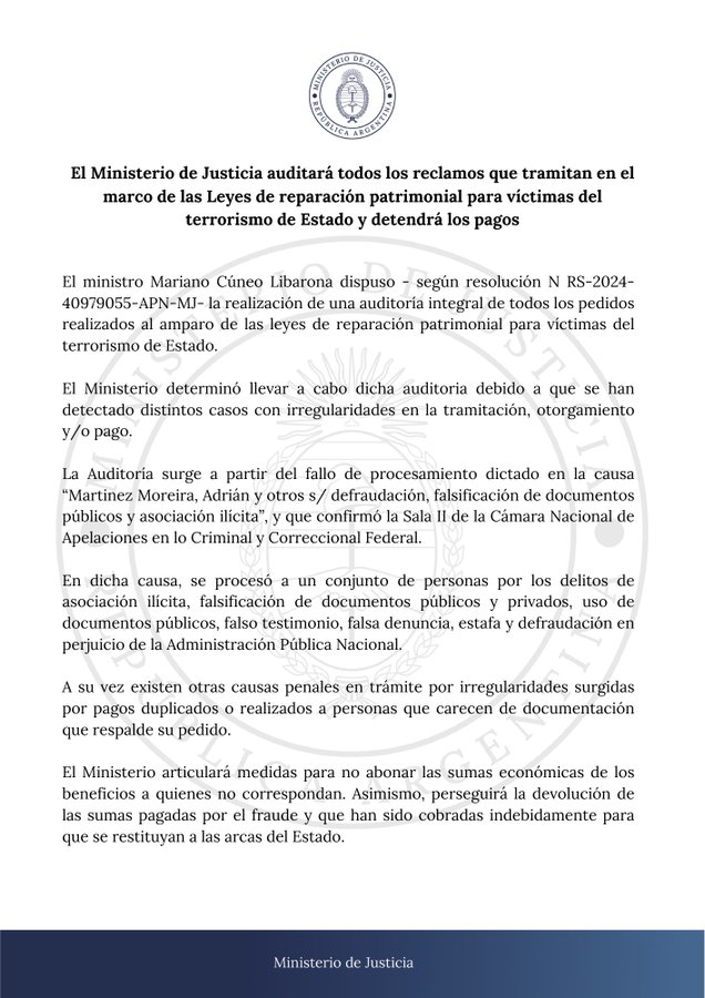 Cúneo Libarona avanzó en la decisión a través de la resolución ministerial N RS – 2024 – 40979055 – APN – MJ, mediante la cual se impone una auditoría integral de todos los pedidos realizados al amparo de las leyes de reparación patrimonial para víctimas del terrorismo de Estado.