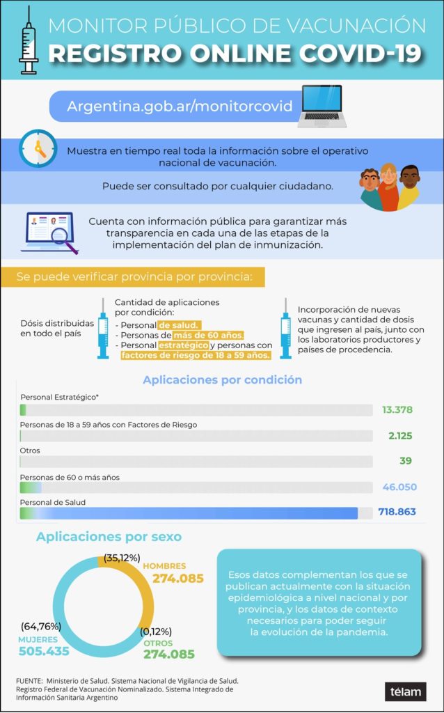 En el Monitor pueden verificarse las dosis distribuidas en todo el país, así como la cantidad de aplicaciones por condición (personal de salud, personas de más de 60 años, personal estratégico y personas con factores de riesgo de 18 a 59 años).