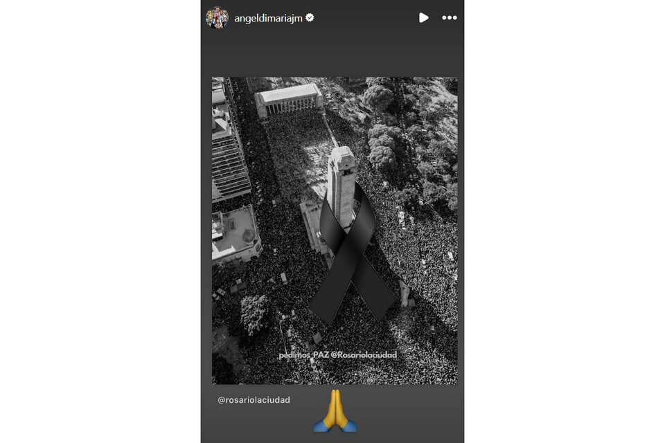 El futbolista compartió una imagen del Monumento a la Bandera junto a una insignia de luto y con la leyenda: «Pedimos PAZ», acompañada de un emoji rogando por el fin de la brutalidad en tierras rosarinas.