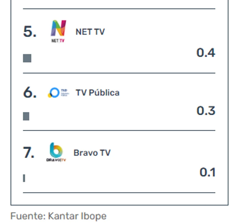 Net TV fue el menos peor, con un acumulado diario de 0.4, lo siguió la Televisión Pública con 0,3 y esta lastimosa lista la cerró BravoTV con 0.1, que al menos esta vez se salvó del humillante 0.0, algo que pasó más de una vez aunque parezca extraño.