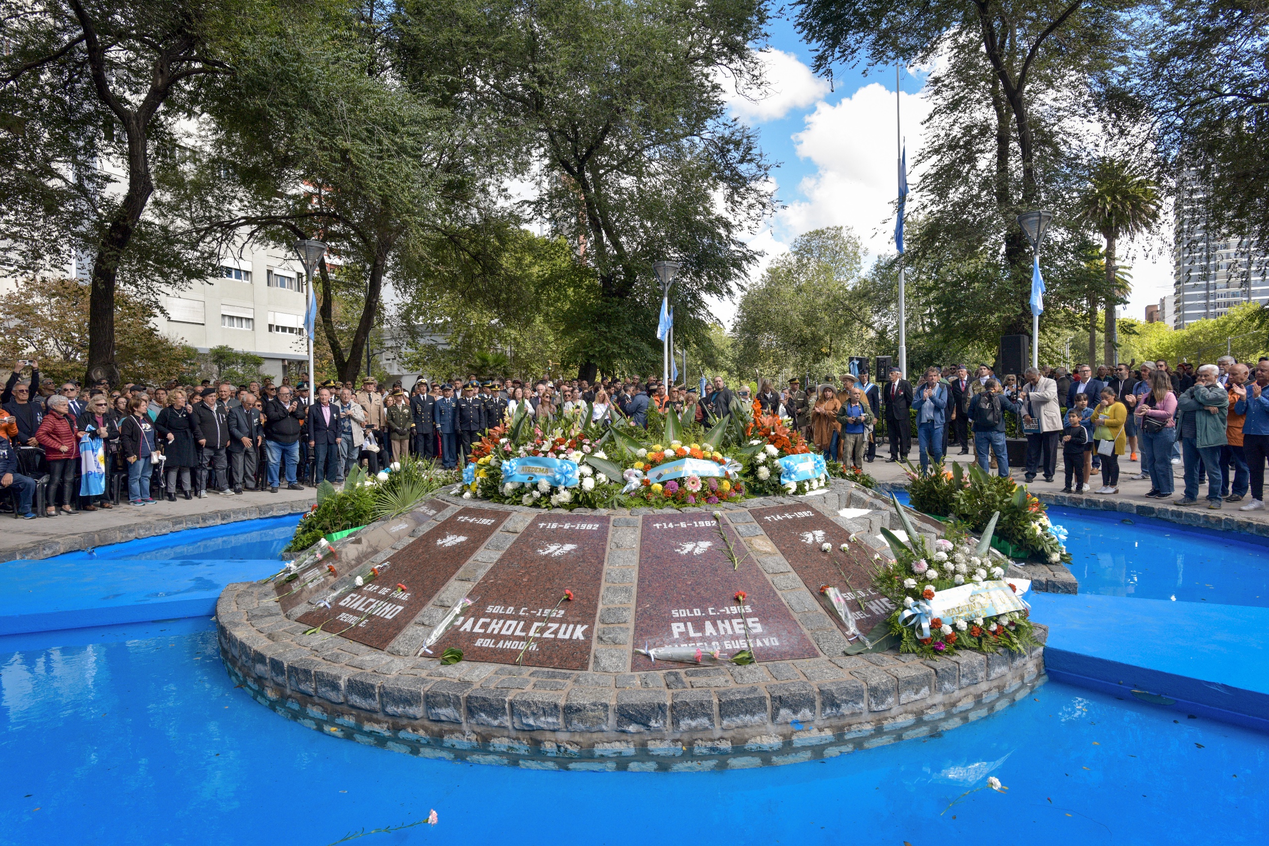 Mucho tiempo, mucha historia, y durante casi un tercio de esos 150 años los soldados combatientes de Malvinas allí estuvimos. Somos la historia viva en gran parte de ese transitar, de ese crecer de nuestra ciudad. Cuando en el futuro se hable del saladero, de los jesuitas, también se dirá que esta ciudad entregó sus hijos a la Patria. Hijos que caminaron estas mismas calles, que aprendieron a nadar en estas mismas playas. Un tercio de la historia de nuestra ciudad no es poca cosa. Todas las unidades de las FFAA con asiento local aportaron personal al conflicto. Ya se trate de nativos o residentes, partieron al combate desde aquí. Mar del Plata tiene héroes, que realizaron el mayor sacrificio que un hombre puede hacer por su Patria, dejaron sus vidas en Malvinas, y es en este lugar, donde dejan sus nombres para la posteridad. Como cada año nos reunimos en este sitio para rendir honores y decir orgullosamente: ¡¡¡Aquí estamos Mar del Plata!!!