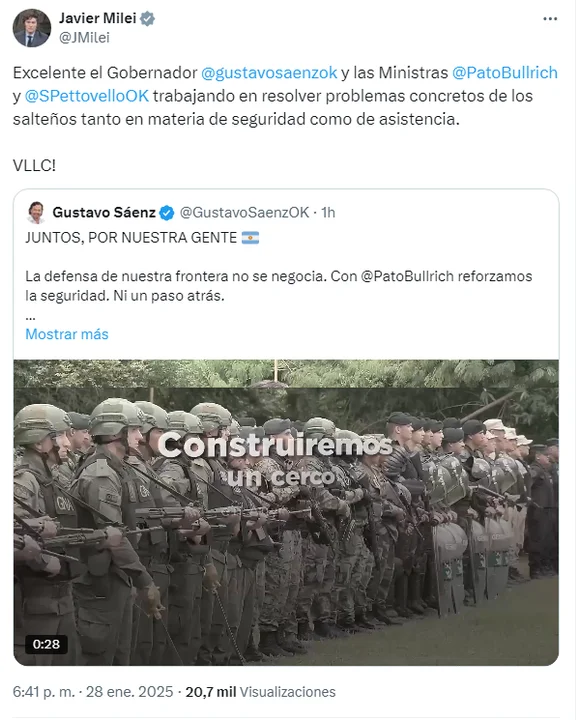 «Excelente el gobernador Gustavo Sáenz y las ministras Patricia Bullrich y Sandra Pettovello trabajando en resolver problemas concretos de los salteños tanto en materia de seguridad como de asistencia«, expresó el mandatario en sus redes sociales, al ponderar las gestiones de las carteras de Seguridad y Desarrollo Social, respectivamente.