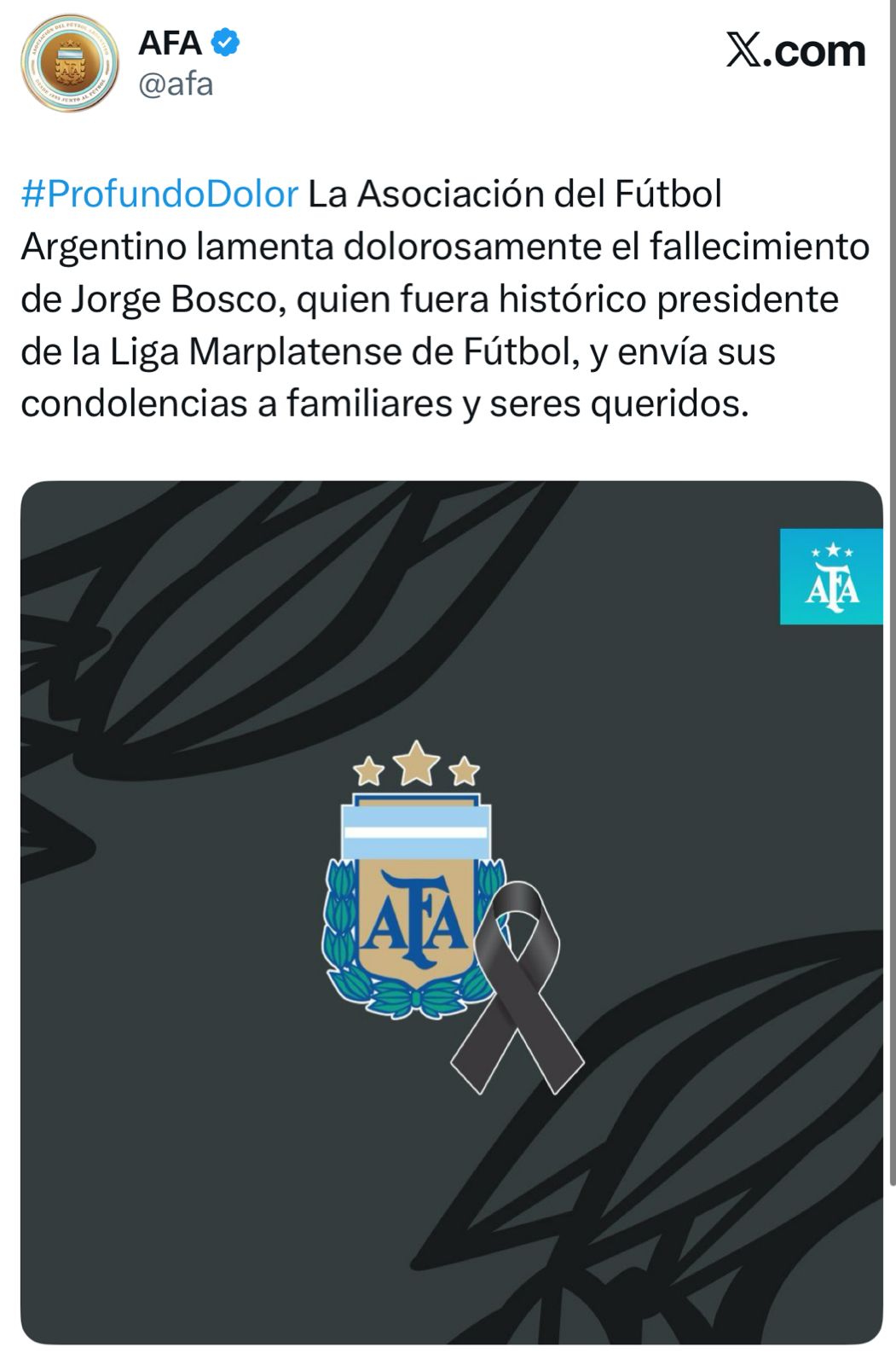 La Liga Marplatense de Fútbol lamenta el fallecimiento de Jorge Bosco, ex presidente de dicha institución en la que dejó una marca imborrable basada en su compromiso y lucha para que la ciudad ocupe un lugar de relevancia en el deporte nacional.