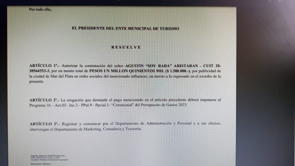 En cuanto a “Soy Rada” versiones indican que se lo contrató para publicitar a Mar del Plata en las redes sociales del influencer por un monto total de $ 1.500.000.