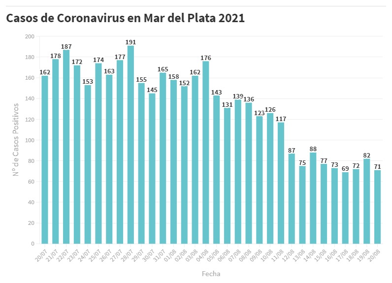 En el último informe del SISA reportado hoy se confirmaron 71 nuevos pacientes en tratamiento por Covid-19 en General Pueyrredon, de los cuales 15 corresponden a casos definidos por criterio clínico epidemiológico y 56 a estudios laboratoriales realizados desde el 13 al 19 de agosto.