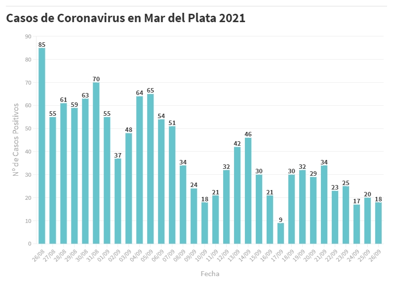 En el último informe del SISA reportado este domingo se confirmaron 18 nuevos pacientes en tratamiento por Covid-19 en General Pueyrredon, de los cuales 2 corresponden a casos definidos por criterio clínico epidemiológico y 16 a estudios laboratoriales realizados desde el 22 al 25 de septiembre.