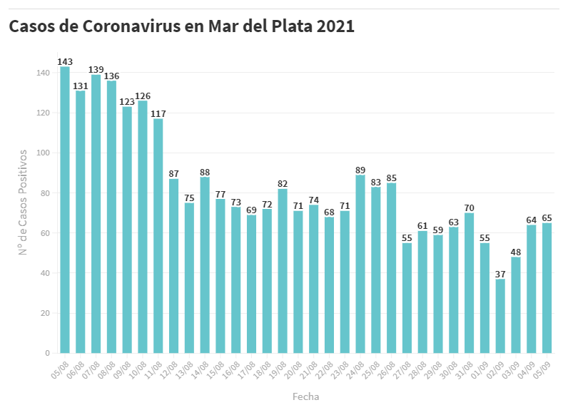 En el último informe del SISA reportado hoy se confirmaron 65 nuevos pacientes en tratamiento por Covid-19 en General Pueyrredon, de los cuales 6 corresponden a casos definidos por criterio clínico epidemiológico y 59 a estudios laboratoriales realizados desde el 23 de agosto al 4 de septiembre.