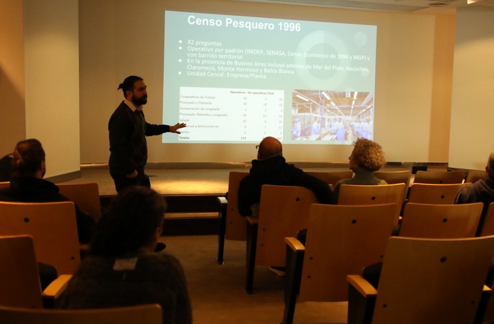 La presentación fue realizada por el geógrafo Diego Solimeno, junto con el economista Saúl Gaviola, responsable del Programa de Economía Pesquera del INIDEP, quienes brindaron detalles sobre la metodología a utilizar y pusieron énfasis en la importancia de actualizar datos sociales y económicos de la industria pesquera marplatense que sirvan de insumos para la elaboración de políticas públicas sectoriales.