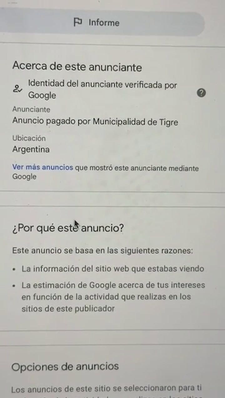 “Podríamos estar en presencia de anuncios de campaña política solventados con dineros públicos”, se advierte en la presentación judicial que se vale de una serie de links que remiten a los anuncios de Google en los que se podía corroborar -hasta antes de ser borrados- que el anunciante y patrocinador detrás de los mismos era el Municipio de Tigre.