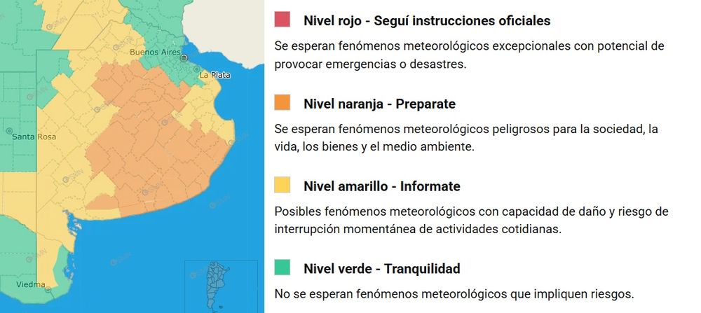 Según las alertas comunicadas por el Servicio Meteorológico Nacional (SMN) en horas de la mañana, las únicas regiones de la provincia que no están bajo alertas son el Área Metropolitana de Buenos Aires (AMBA), el extremo noroeste y la costa de Patagones. Lo cual de todos modos no quiere decir que no estén bajo pronóstico de lluvias, sino que no serán tan intensa como en el resto.