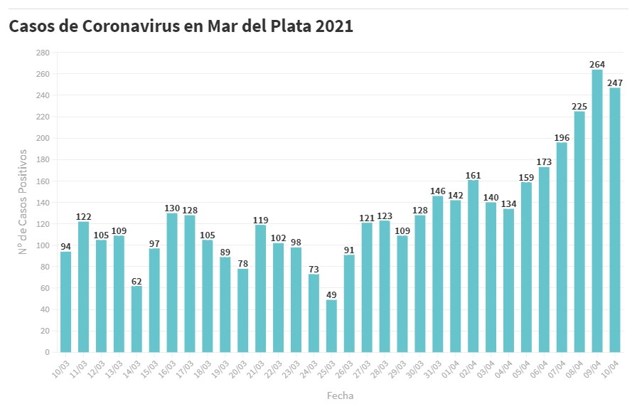 De acuerdo a la Sala de Situación del Ministerio de Salud de la Provincia de Buenos Aires, General Pueyrredón registra al 10 de abril 49.210 casos de coronavirus desde que comenzó la pandemia.
