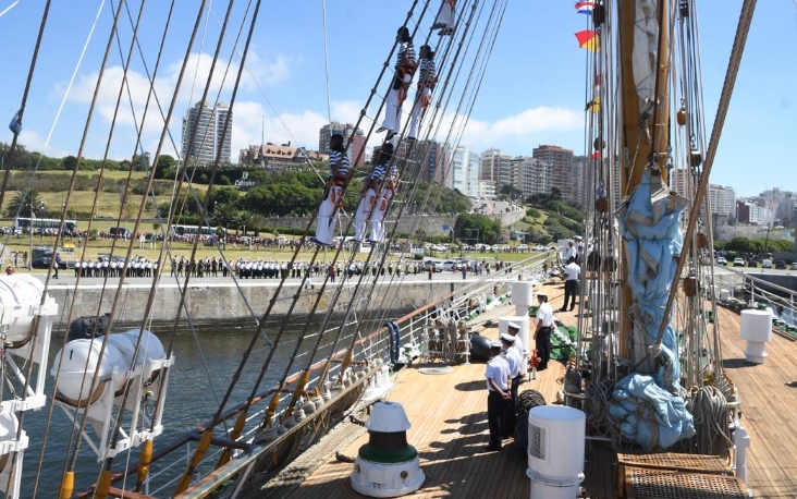 Con la bandera argentina flameando en el palo mayor y decenas de insignias multicolor, la nave arribó con un día soleado y con poco viento, luego de cumplir una travesía de tres jornadas desde que zarpó del puerto de Buenos Aires.