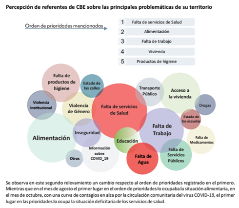 En comparación con el primer informe, realizado en agosto, se han modificado el orden de las prioridades. En el relevamiento anterior la situación alimentaria era la necesidad con mayor importancia por parte de los vecinos y vecinas, mientras que en la segunda consulta, y en medio de un alza en la curva de contagios debido a la circulación comunitaria del virus, la mayor prioridad resulta ser la situación deficitaria de los servicios de salud.