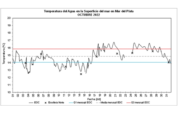 El Gabinete de Oceanografía Física del Instituto Nacional de Investigación y Desarrollo Pesquero (INIDEP) informó que la temperatura del agua en la superficie del mar en Mar del Plata durante octubre promedió los 14,8°C.