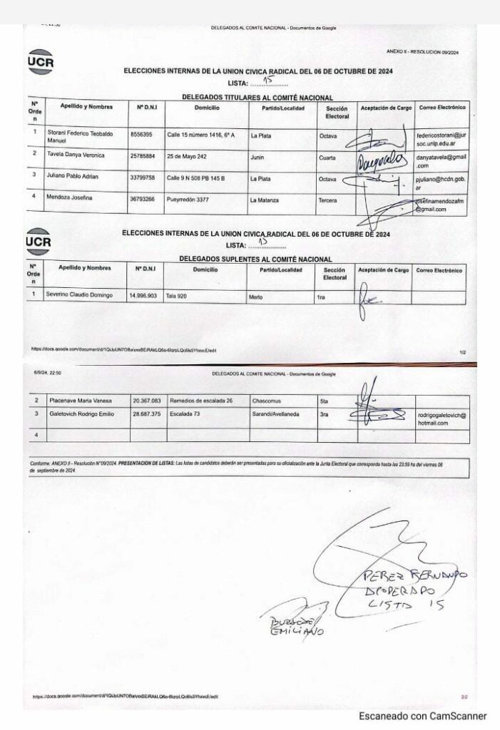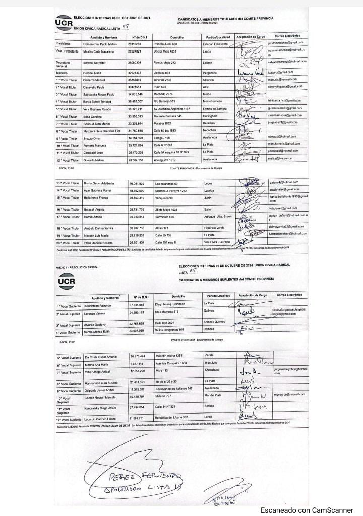 Candidatos a miembros titulares del comité provincia, presidente: Pablo Matías Domenichini, vicepresidente Carla Nazarena Mesías