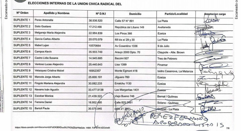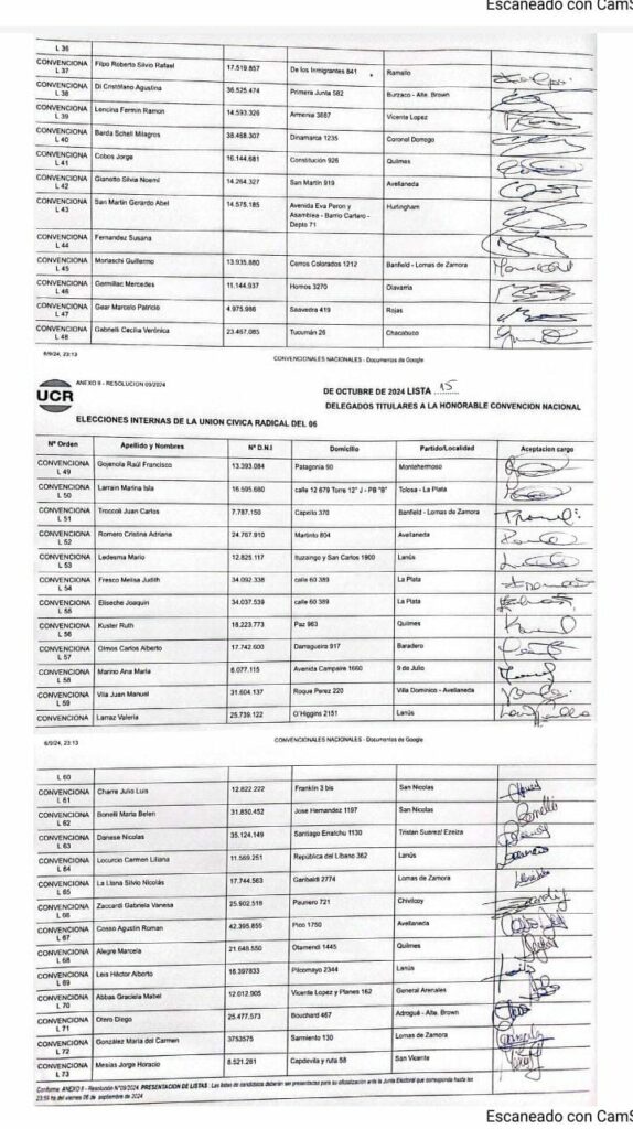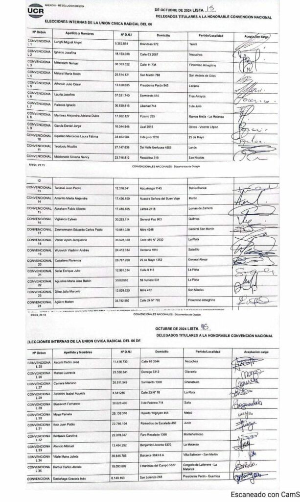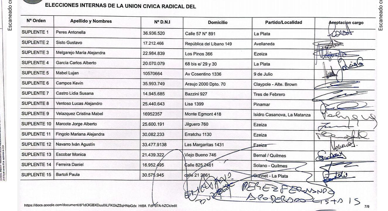 Delegados titulares a la Honorable Convención Nacional: 1) doctor Miguel Lunghi, 2) Josefina Ignacio, 3) Mittelbach Daniel, 4) Malaisi María Belén, 5 ) Julio César Alfonsín