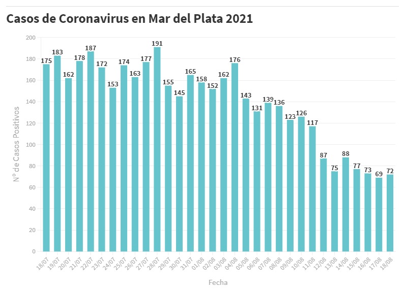 En el último informe del SISA reportado hoy se confirmaron 72 nuevos pacientes en tratamiento por Covid-19 en General Pueyrredon, de los cuales 6 corresponden a casos definidos por criterio clínico epidemiológico y 66 a estudios laboratoriales realizados desde el 9 al 17 de agosto.