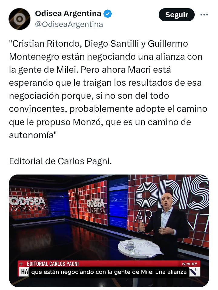 No han sido prósperas las conversaciones en ese sentido y una oscilación entre las posibilidades de una tercera posición, y se ha comenzado a vislumbrar tras el arrastre que provoca entre los gobernadores que observan cómo Milei los dejan a la deriva en materia de recursos para gestionar a sus territorios, un problema que también llegará por ejemplo a los 135 intendentes de la Provincia de Buenos Aires, y obviamente CABA y las 22 provincias.