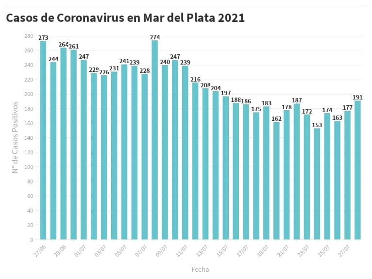 En el último informe del SISA reportado hoy, se confirmaron 191 nuevos pacientes en tratamiento por Covid-19 en Mar del Plata, de los cuales 5 corresponden a casos definidos por criterio clínico epidemiológico y 186 a estudios laboratoriales realizados desde el 10 al 27 de julio.