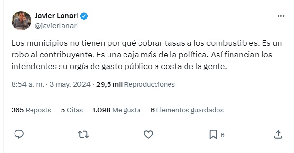 “Vengo insistiendo sobre la voracidad fiscal inconstitucional de varios intendentes de la Provincia que crean impuestos disfrazados de Tasas sin contraprestación al consumidor. Faltan jueces republicanos que se pongan los pantalones largos y protejan al contribuyente”, consideró este jueves tras los dichos de Adorni.