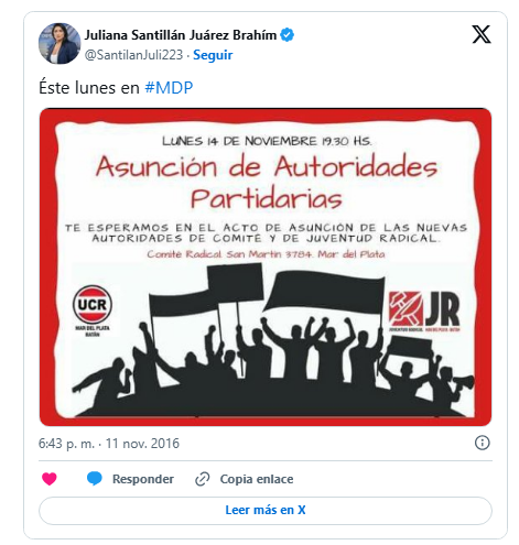 La reconstrucción de sus primeros pasos en política tampoco es clara. Dice que comenzó a militar en 2015, pero fotos suyas junto a Elio Aprile, exintendente de Mar del Plata, la muestran activa al menos desde los años 2000.