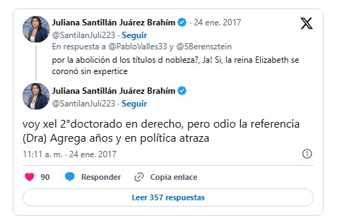 En su declaración jurada dice que cuenta con estudios universitarios. Pero en sus redes y en su perfil como diputada se presenta como “diplomada en economía austríaca” por la Escuela Superior de Economía y Administración de Empresas (Eseade), la institución fundada por Alberto Benegas Lynch (h), padre del compañero de bancada homónimo de Santillán. Lo que cursó para obtener su diploma terciario fue un programa ejecutivo online de 19 encuentros (dos meses y medio de duración).