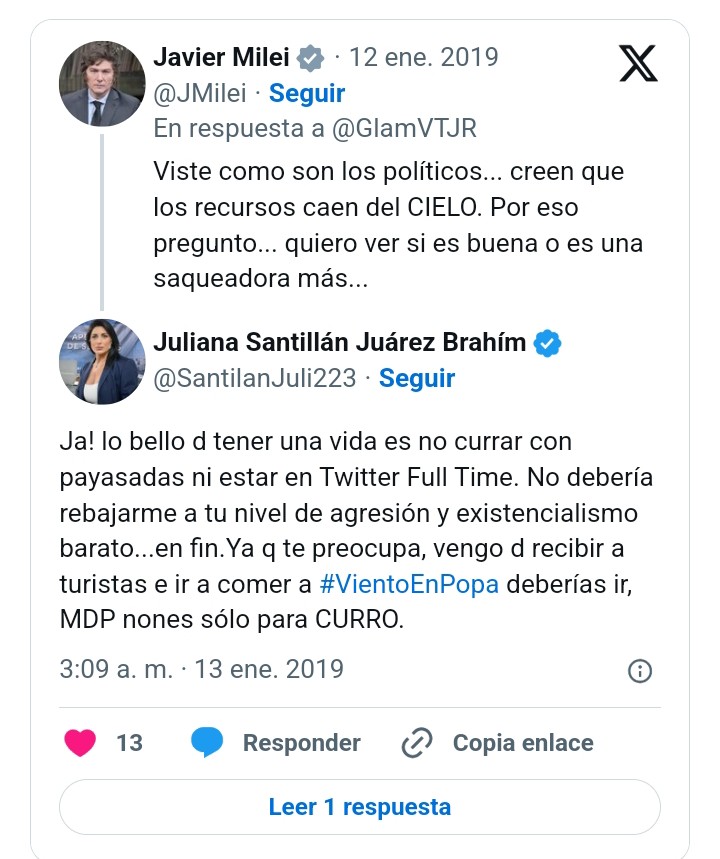 Pocos años antes, sus intercambios con Milei eran vía twitter, aunque menos amistosos. En 2019, el entonces economista que recorría los canales de televisión le exigía explicaciones cómo financiaba Vidal los programas de la provincia de Buenos Aires. “Avisa si vas a seguir sin contestar así ya dejas en claro que no sabes del tema y listo”, la desafiaba. Ella respondió con acidez, aunque sin ninguna referencia económica: “Ja! lo bello d tener una vida es no currar con payasadas ni estar en Twitter Full Time. No debería rebajarme a tu nivel de agresión y existencialismo barato”.